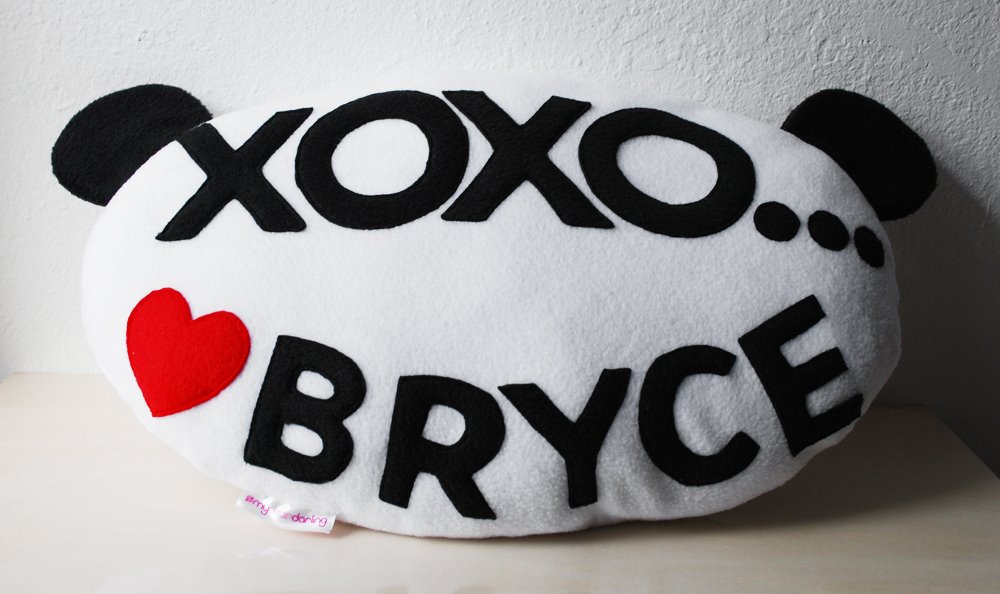 I’m sure many of you wonder how I personalize my pillows. Here’s a sample of a personalized panda pillow I made for BB. I don’t screen print the letters or symbols, they are all sewn on. I’ll be posting more personalized plush soon, so keep checking back! 😀