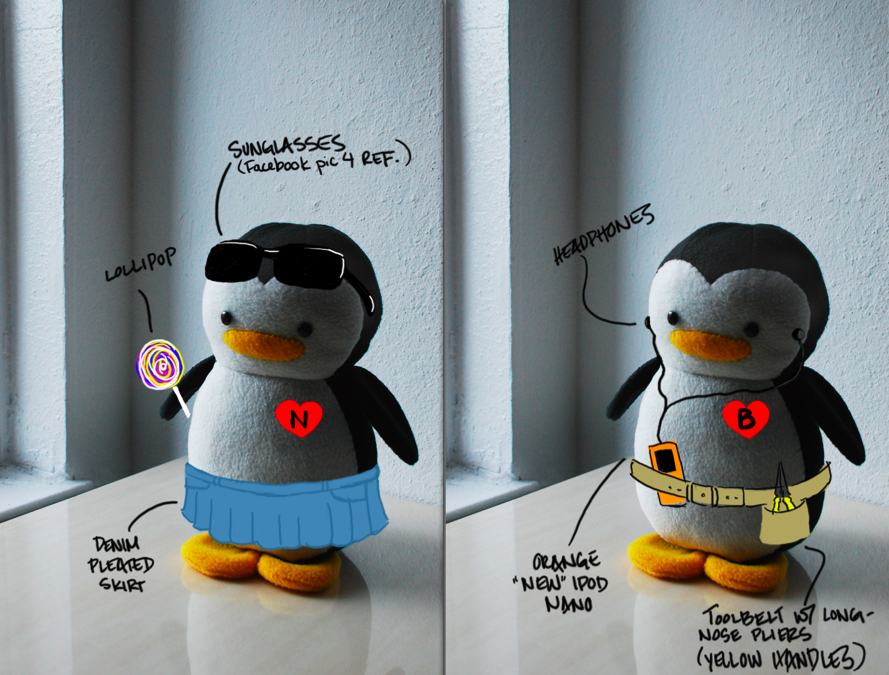 Now, my BFF does all of the above. She’s beautiful, thoughtful, giving, I mean, seriously, the whole package! (Do I sound a bit crazy about her? Lol, I’m just VERY thankful.) But on top of that, she pushes me to better myself; not just personally but also with My Dear Darling. And a wonderful example of that is her personalized penguin order. Last month, she sent me a sketch of what she envisioned of her two penguins; herself and her bf. Oh, I forgot to mention “DETAILED” sketch with side notes, reference pix, and all. 🙂 I love working on personalized orders and each one has its challenges. But I admit, these penguins were the most challenging. I have new found respect for ANY artist who creates miniature ANYTHINGS. I started out with the pliers thinking they were going to be the easiest prop, but nope. Lol, I don’t think I’ve brainstormed that many ways of creating one item because my hands were too big or the fabric piece was too small. My favorite project was the lollipop. 😀 I mean, who could turn down the sweets? YUM! After working out all the technical challenges, I sent off the penguins and she gave them to her bf for Valentine’s Day. Awww. *heart* They both absolutely loved them and sent a picture of them on his shelf: