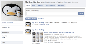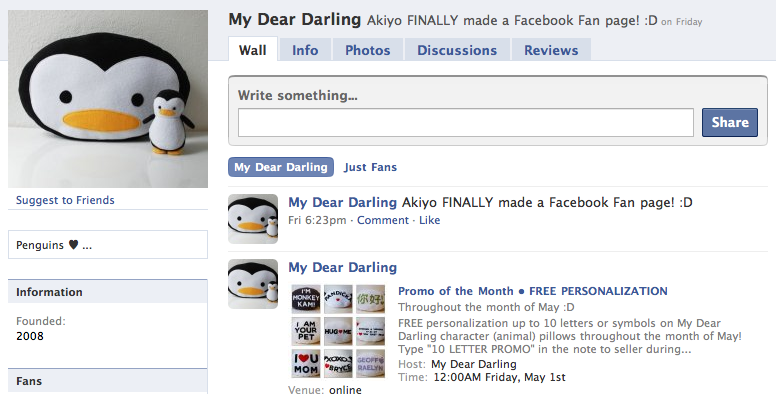 Now you can become a fan of My Dear Darling on Facebook! Get the inside scoop on the latest news, giveaways, and even secret sales only for FB fans. Check out photos, comment, discuss, and upload fan moments here. 🙂