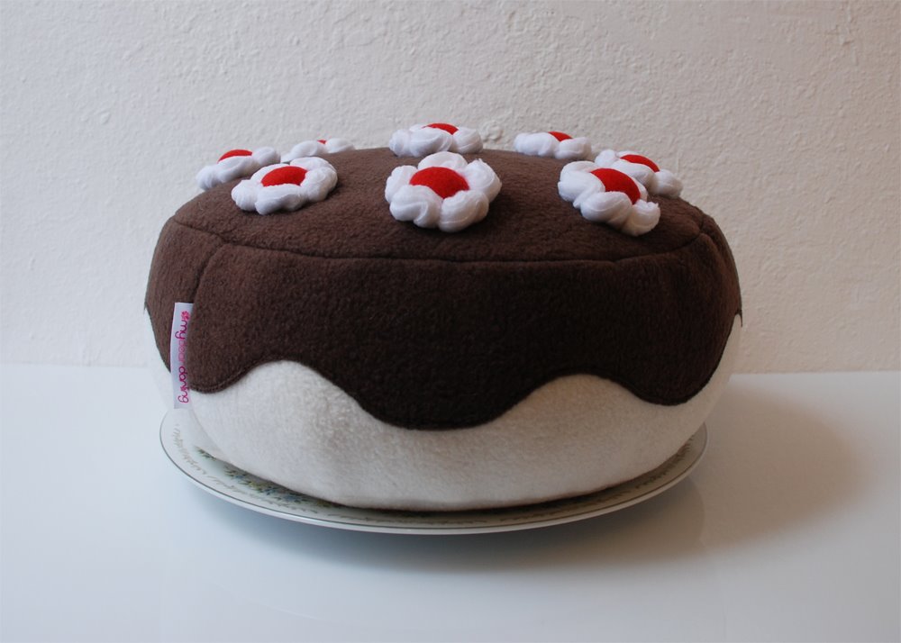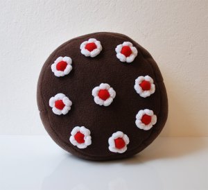 Here’s a huge chocolate cake plush (pillow?) that measures about 11 inches wide. Yum! ๐ I tried posting this earlier but the internet connection was horrible. So instead, I watched my sister bake an Angel Food cake (delicious!) and a marble cake with chocolate frosting for one of my other sister’s friend. Hehe. I got to taste all the leftovers and boy, were they yummy!