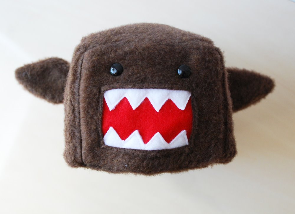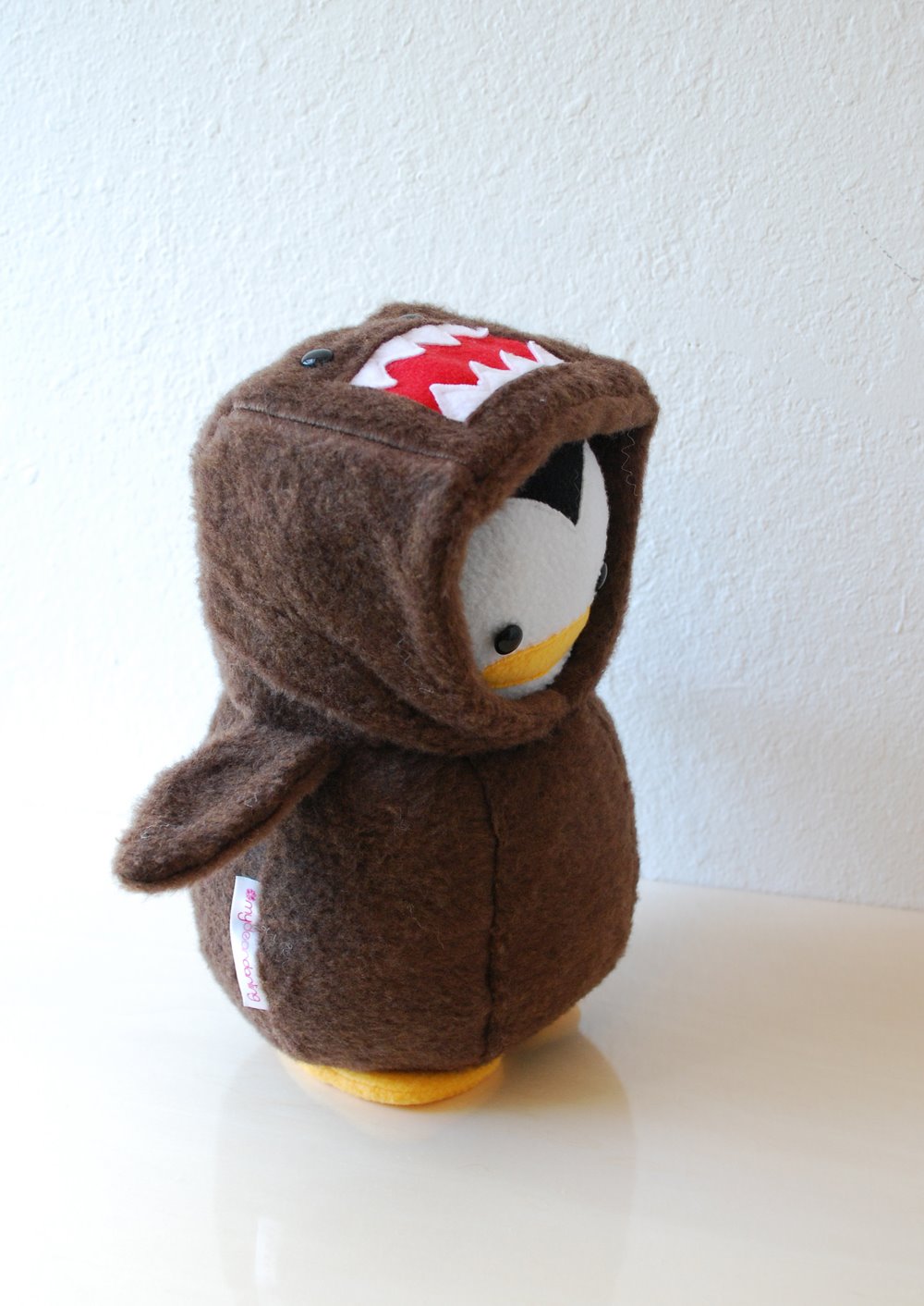 Domo-Penguin! 😀 This little guy is made out of fuzzy fabric (a bit different from the fleece that I’m use to). I was covered in brown fuzzies while creating him and was worried he’d turn out bald by the time I finished. But thankfully he didn’t shed too much. The Domokun Penguin is a rare find. He now resides in Guatemala with his new best friend. 😀 Made by me, ordered by B, given to A.