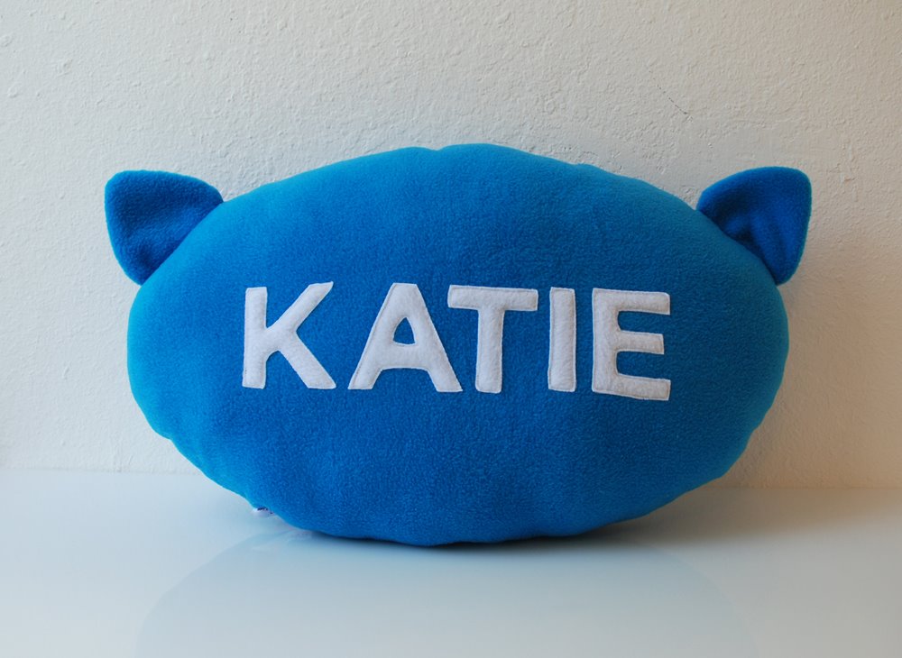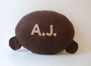 These personalized pillows were for various special customers… Actually, one was a gift to a friend of mine. “THIS FACE!” is a phrase V uses ALL the time… (You should trademark it if it isn’t already! Hehe.) so it was only appropriate to personalize his panda (because he reminds you of a panda bear) for his golden birthday last month. Whoa. I just realized that my husband’s golden birthday was April, V’s gb was May and my BFF, B’s, gb is this month! Lots of birthdays. ๐ “KATIE” was my first owl pillow order! It was so fun working with the bright blue again. It brings a smile to my face every time. And “A.J.” was a personalized monkey pillow. Hehe, my sister saw this photo and was worried that I had personalized it upside down. But the monkey’s ears are just lower compared to the other animals. ๐
