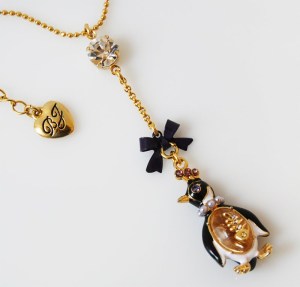 When I opened the box and found this sweet penguin necklace, I couldn’t stop myself from smiling so big! 😀 It’s a Christmas present from my mother. She was out shopping for presents and happened to see this penguin necklace and immediate thought of me. So she just had to get it. I absolutely LOVE the details, especially the clear stomach with the bone of an eaten fish!