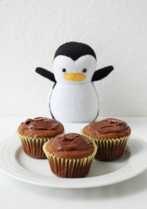 *Meanwhile, put the remaining chocolate chips in a microwave-safe bowl and melt in short bursts in the microwave. Stir until smooth. Using a teaspoon, swirl the melted chocolate thickly over the top of each cupcake.