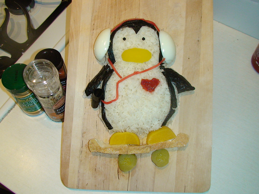 Ingredients: rice, nori seaweed, pickled daikon, sri racha hot sauce, boiled eggs,