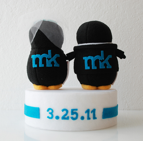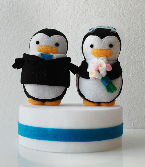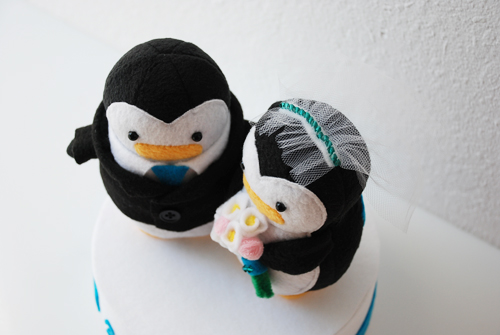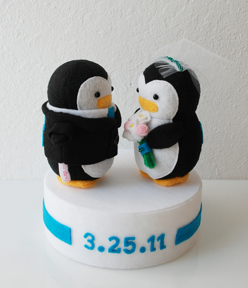 I have been wanting to share these special penguins with you for the longest time! 😀 It’s been almost a year since I first started working on them for a special client. I had been wanting to make a wedding cake topper type plush but never had the chance to until Kristine asked if I could make one for her. I jumped at the opportunity and after many emails back and forth and testing different materials, these two love birds made it to a very special wedding!