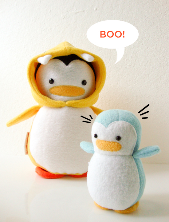 penguin in a dinosaur costume surprising a mini penguin