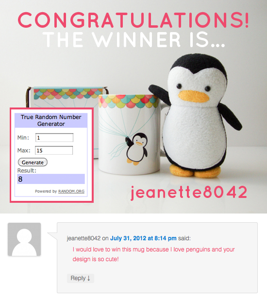 Fly High Mug Cup Winner by Akiyo Pham Posted on August 4, 2012 Thank you so much for everyone who entered the giveaway! 😀 Have a wonderful weekend!! Lots of Smiles, Akiyo Like Loading... Related
