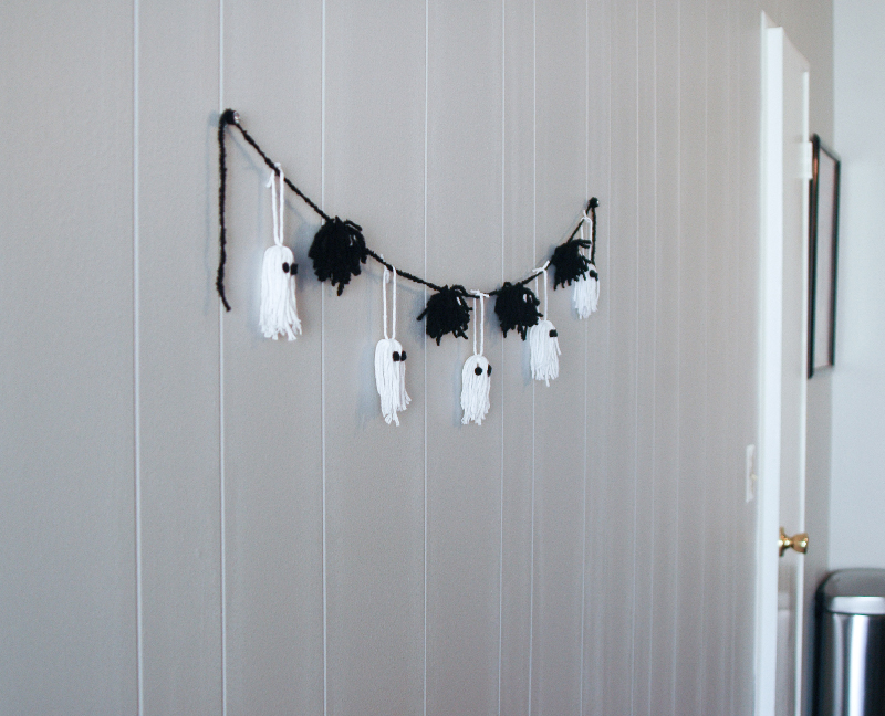 Of course, I had to do all the cutting, tying, and gluing but Bruce had fun helping me count the yarn, pulling out the yarn, playing with the spiders, and placing the eyes on the ghosts. Every once in a while, when we pass by the garland, he points to them and says, “ghos! ghos!” which makes me so glad we made it together. 🙂