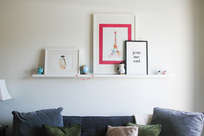 In case you’re planning to use a picture ledge with Ikea ledges, it’s a good idea to hang the bigger frames directly on the wall because they will fall very easily. Not only do we live in a state with frequent earthquakes, but this wall has a staircase running behind it, an entryway door on the left, and continues down to our downstairs neighbors who tend to slam their door. So it shakes quite often and we didn’t want to risk anything falling on us. I haven’t secured the little other things, but if you want to be extra safe, you could use sticky dots for light objects. I’ve only had the mini penguin fall once but I think it was just because he was sneaking around the house when we weren’t looking. đ