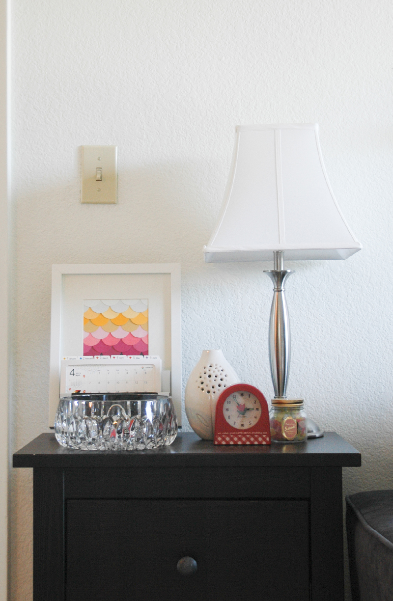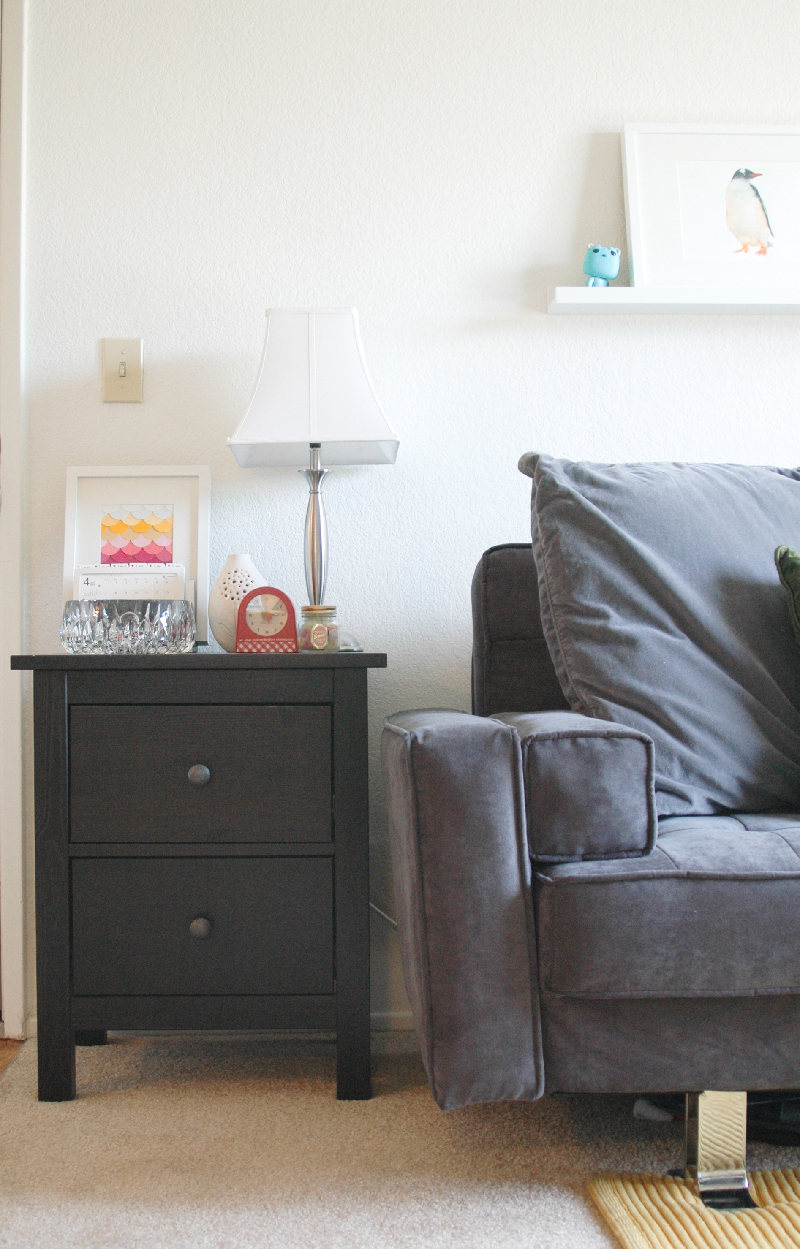 Our nightstand doubles as an entryway catchall and offers a lot of storage to hideaway a lot of clutter. (Don’t mind Bruce’s folding chair under the sofa.)