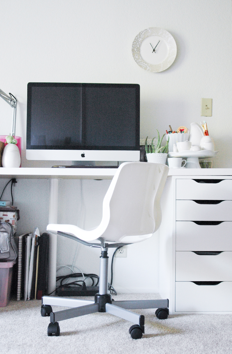 Another purchase from Ikea was a Snille office chair. They fit my body perfectly. It’s not my ideal office chair, but Brandon and I figured we could get something that’s comfortable enough for now until we save up to buy a better one. I was using the dining chairs before this and it would kill my back everyday because there was no support. So far, I’m loving my Snille. 🙂 I did have a hard time choosing between the hot pink and the white. But I chose white because I figured I could just put a pink cushion if I wanted to add color… Or maybe paint a pattern in pink? We shall see!