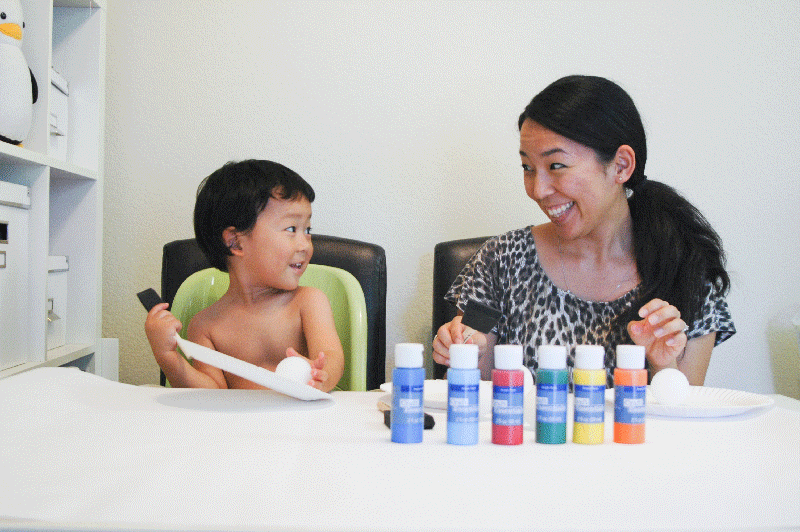 My sweet friend, Diana, had given us a box full of styrofoam balls over a year ago and I had been trying to think of fun ways to use them. Then last week, I had this brilliant (to me!) idea of making a colorful garland for Bruce’s room so he can learn his colors. 🙂 You can see how we painted the balls in the animated photo above.