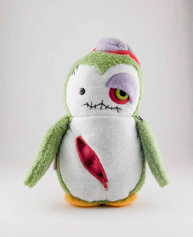 My last piece for Plush You! is the zombie penguin! This one is quite special because he’s made of super cuddly fabric and he can control how much of his guts he’s willing to spill. 😉