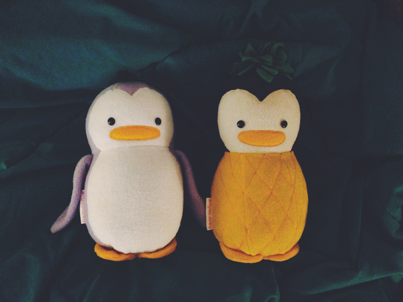 Remember last year’s birthday giveaway? Well, the winner, Christina, sent me these cute photos of her new lavender penguin getting right along with her pineapple penguin! 😀